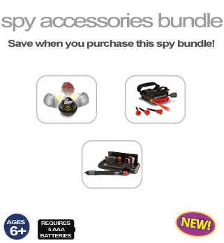 Spy Accessories Bundle This bundle includes three Spy Gear spy toys:Toy 1 - Roll-In Blaster Spy BombToy 2 - Dart BlasterToy 3 - Agent Tool KitRecommended for spies age 6 and up.This bundle requires 5 AAA batteries; sold separately.